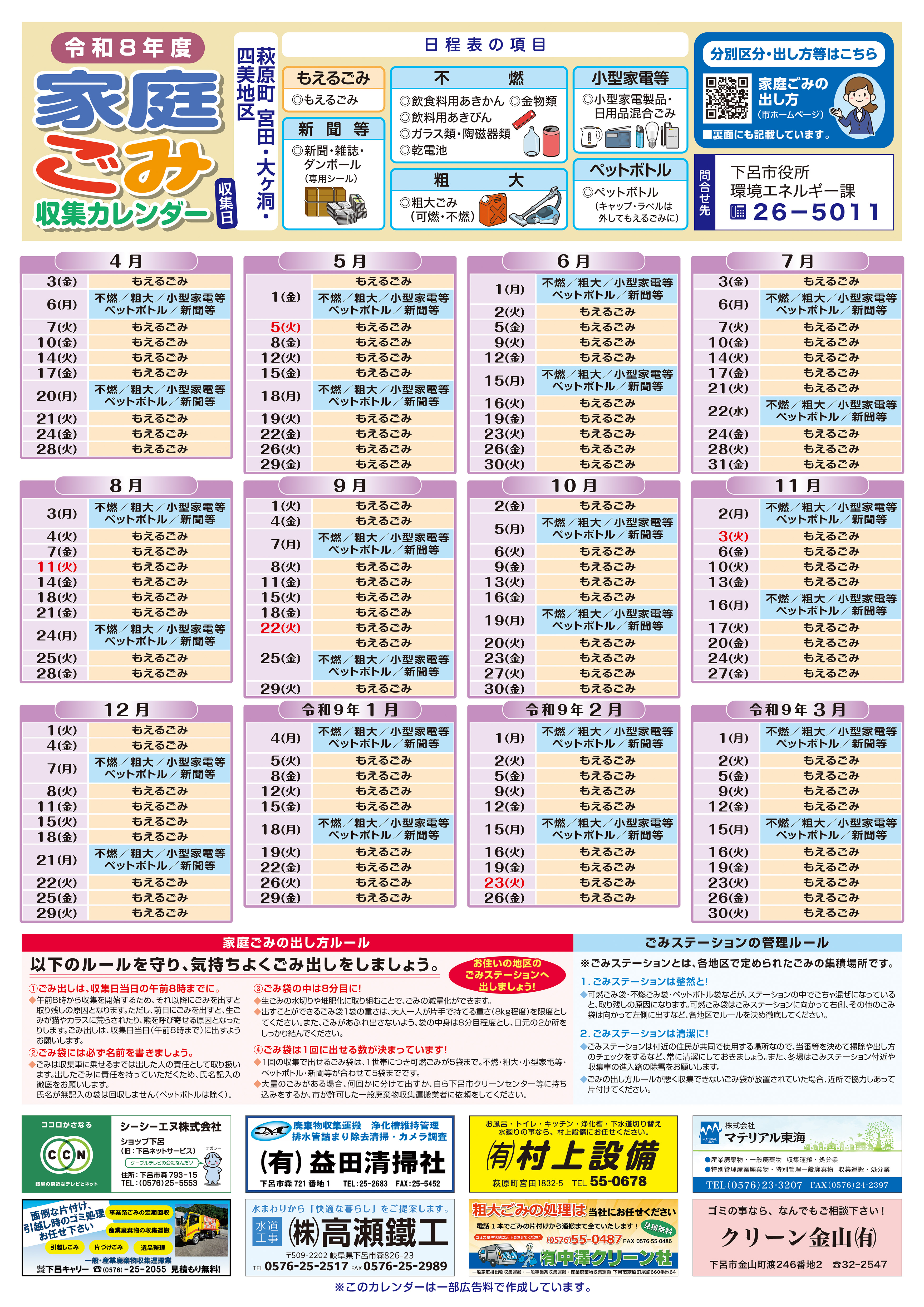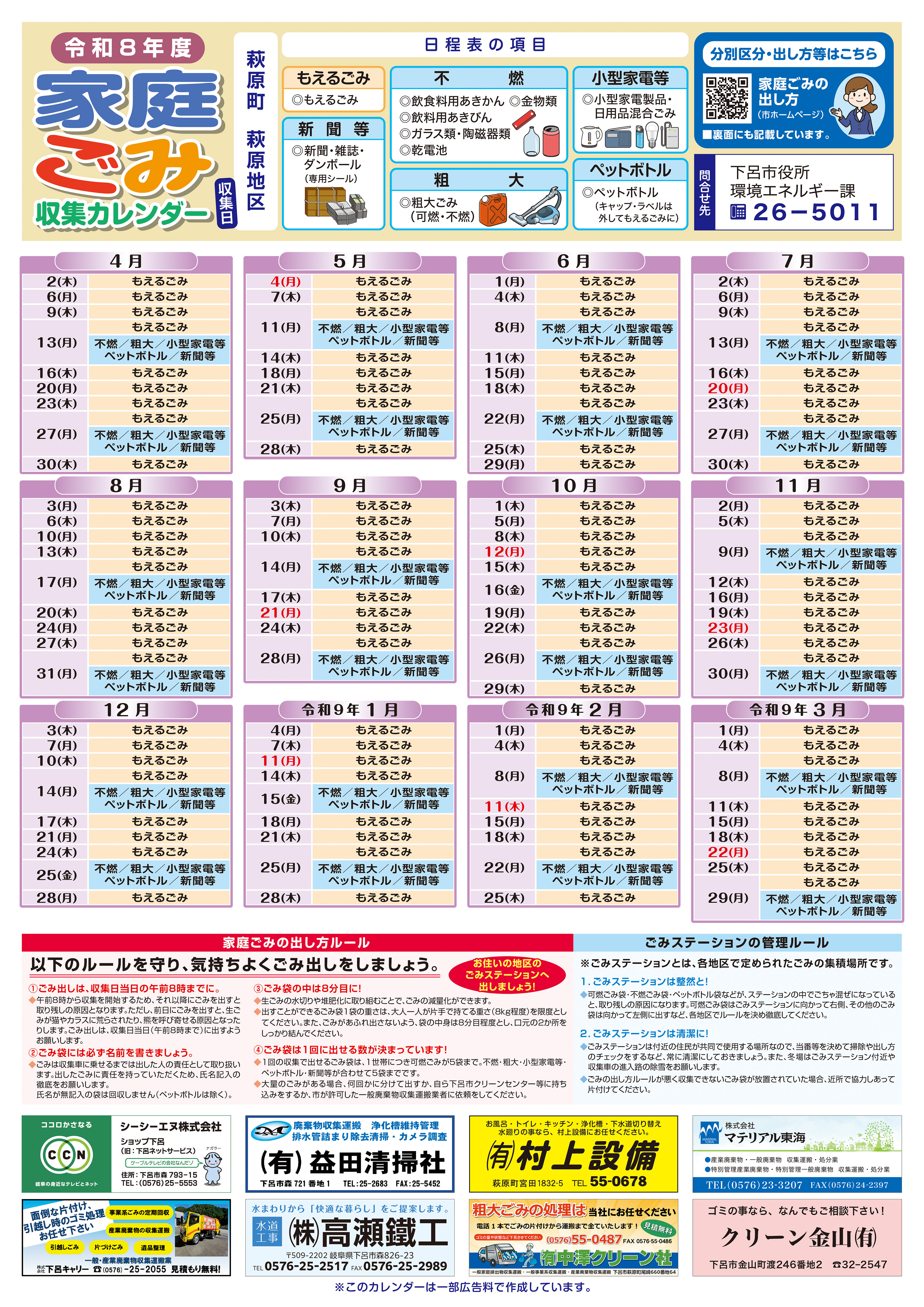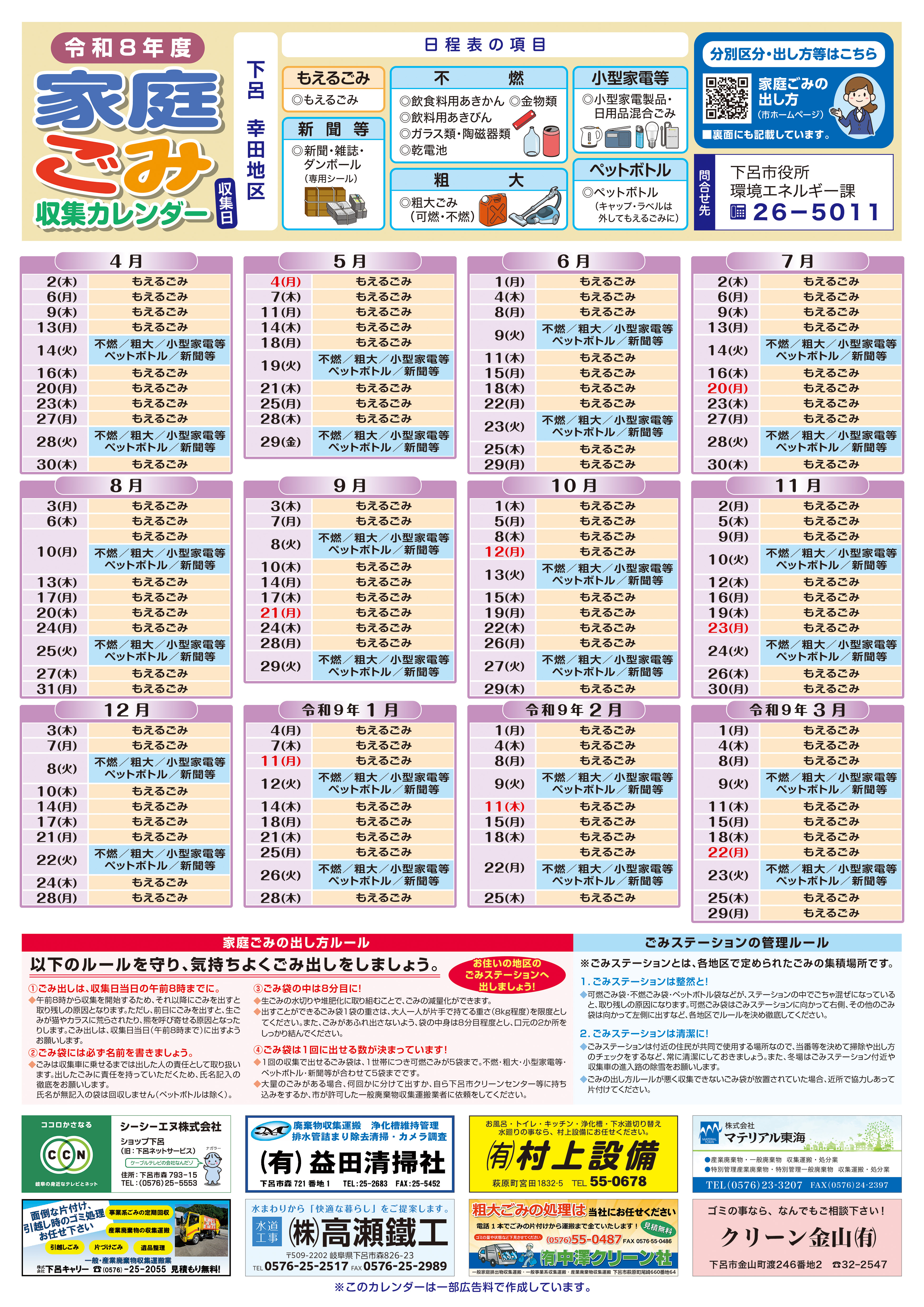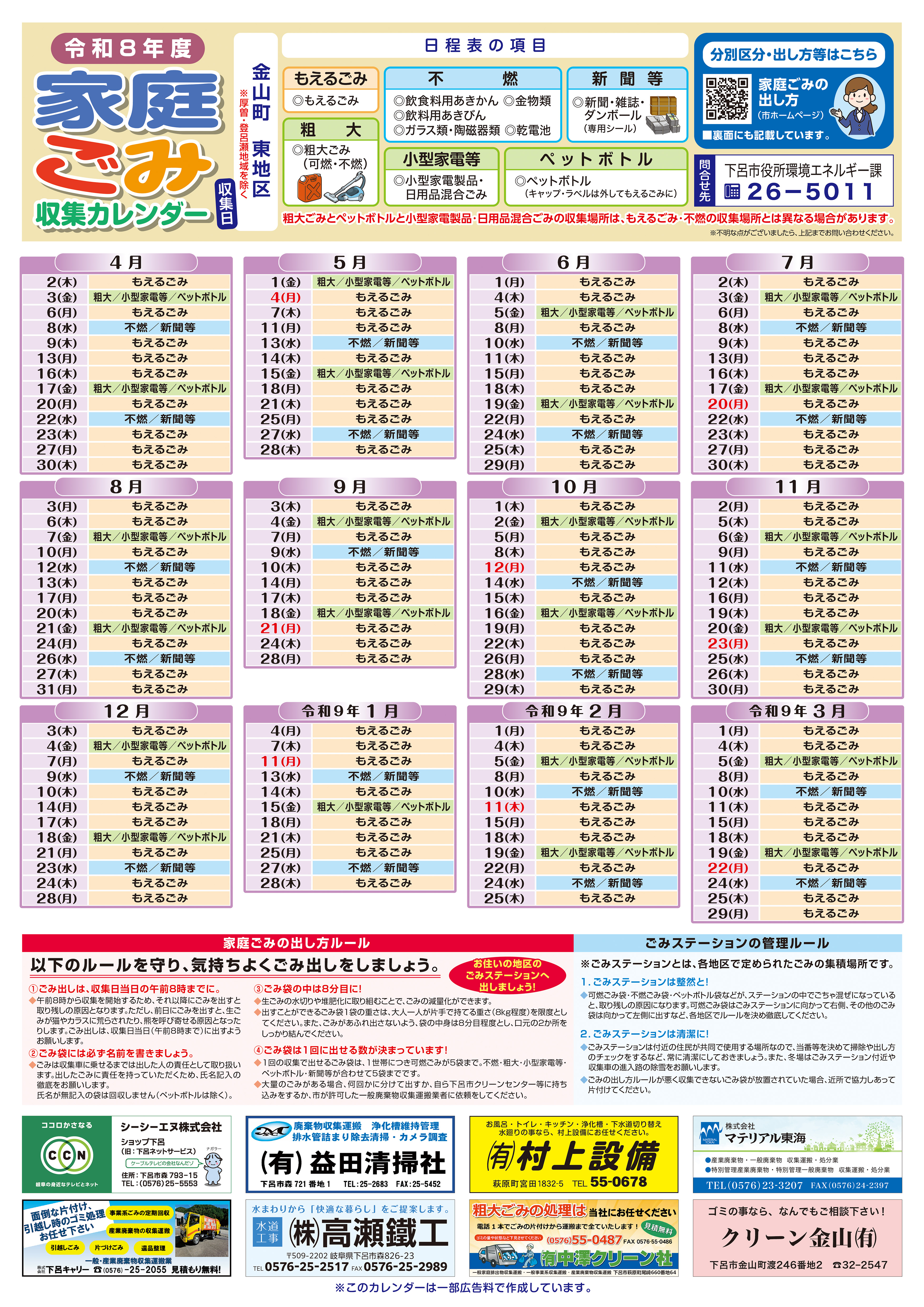 カレンダー裏面:ごみの分別区分および出し方 [その他のファイル/4.08MB]